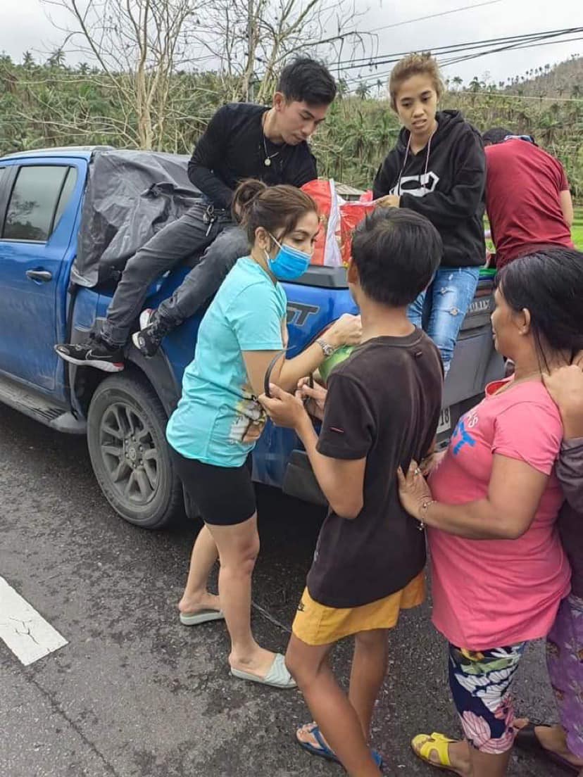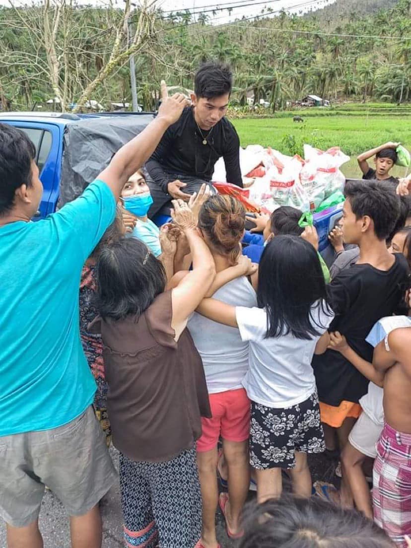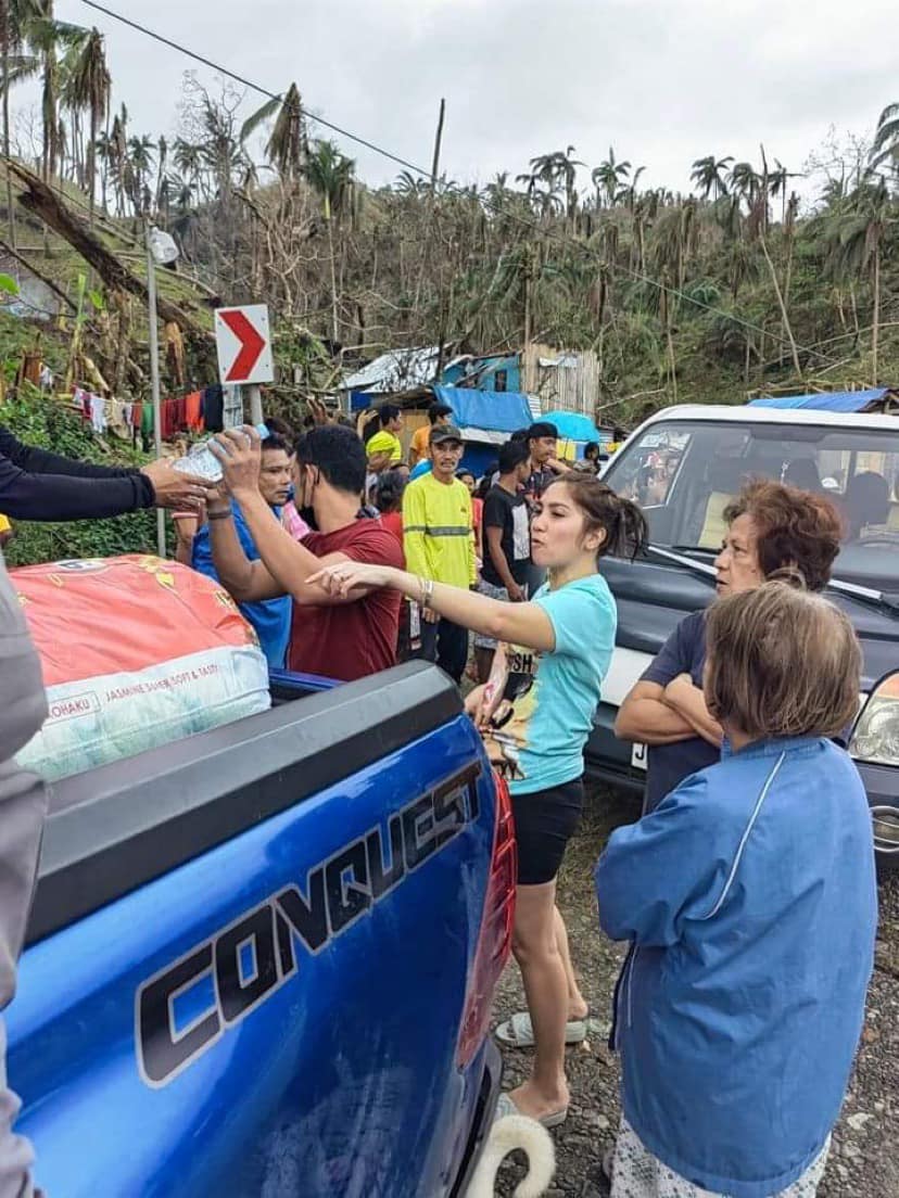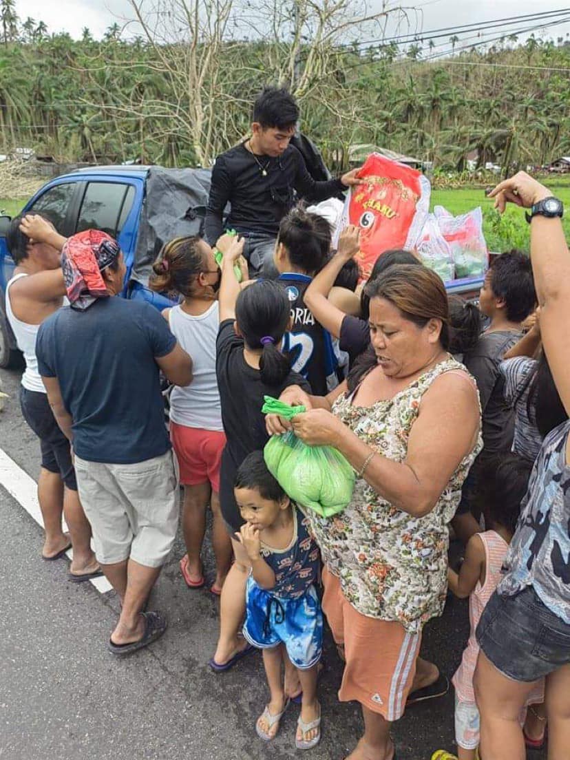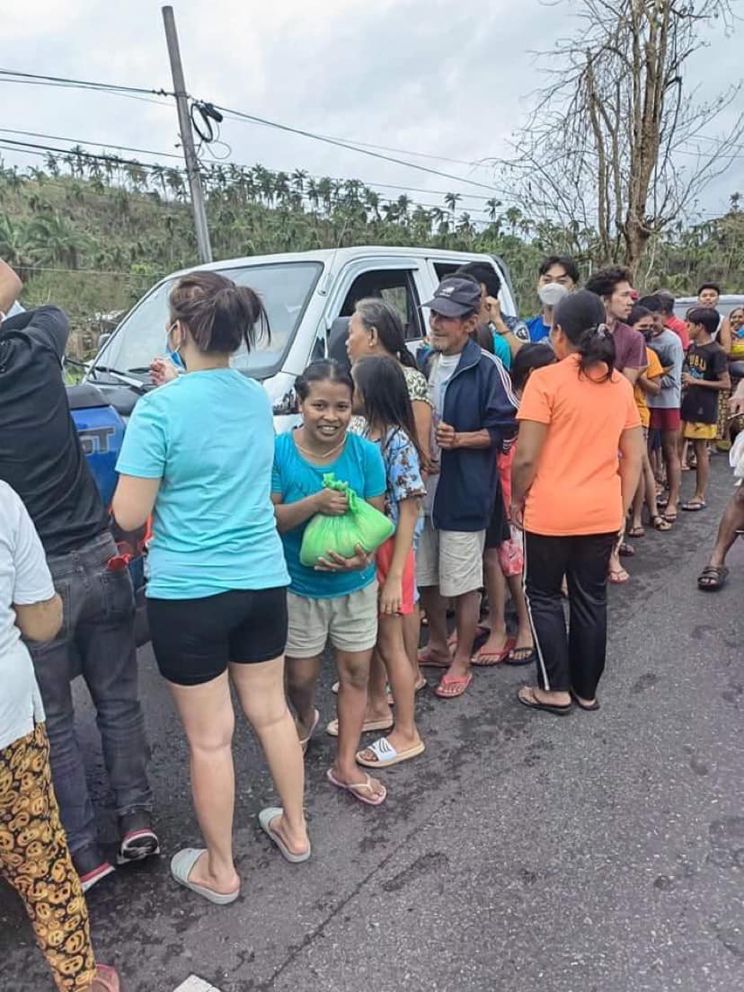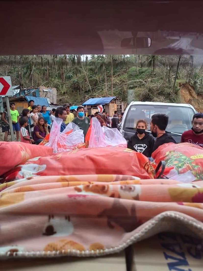 社長(水色のシャツの女性)はとてもバイタリティのあふれる人で、事前に打ち合わせていたエリアに直行し到着すると休む間もなく配給開始、スタッフと長時間の運転で疲れているにもかかわらずる持って来た水や食料それに毛布やタオルケット配り始めました。被災された沢山の人が烈に並び、たくさんの感謝の言葉をいただきました。クリスチャンでフィリピン人ではとても待ち焦がれていた行事のクリスマスが滅茶苦茶になっていた被災者の皆さんに少しでも、元気を取り戻せるように一つ一つ手渡しして、赤ちゃんのいる世帯には粉ミルクも配られました。