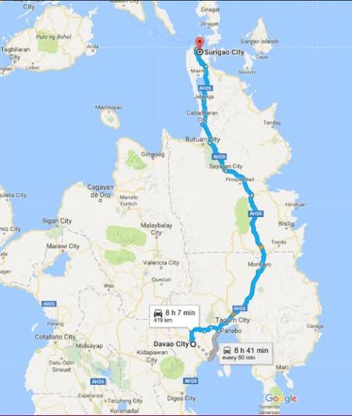 ミンダナオ島のダバオ市から被災地のスリガオ市まで、ナビゲーションの表示で419Km